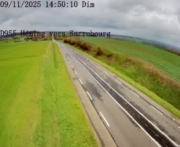 Caméra routière située sur D955 (France) à Heming, orientée vers Sarrebourg, surveillant en continu la circulation locale et régionale.